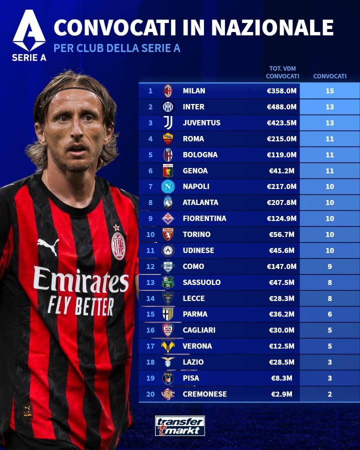 北京时间10月8日,德国转会市场网统计了意甲联赛各队在本月国际比赛日期间被国家队征召的球员人数,其中AC米兰共有15名球员入选,位列榜首;国际米兰与尤文图斯则各有13名球员获得征召。
